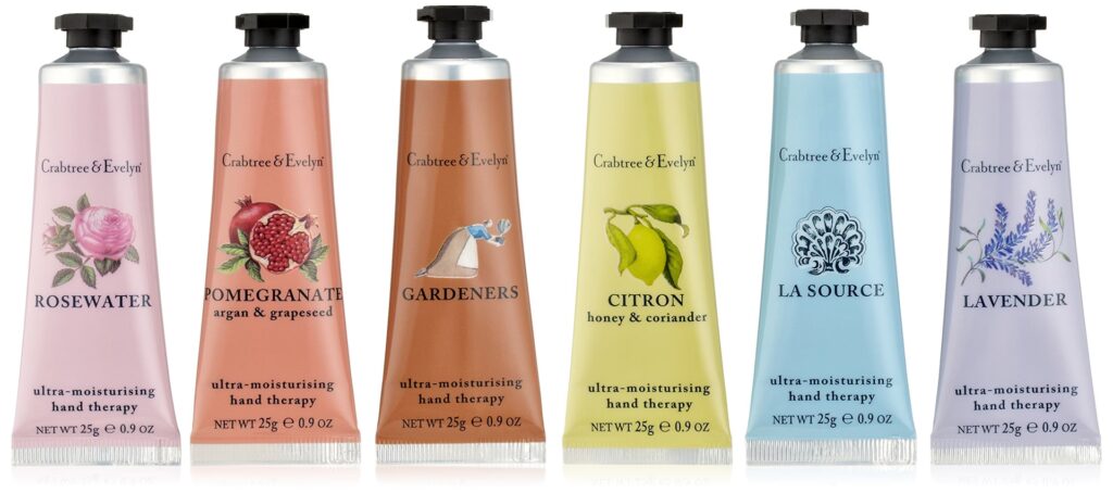 Crabtree & Evelyn słynęła z szerokiej gamy produktów. Ich kremy do rąk były szczególnie popularne i uwielbiane przez szerokie grono klientów, niezależnie od płci czy wieku. Oferowano je w wielu różnych kolekcjach zapachowych.