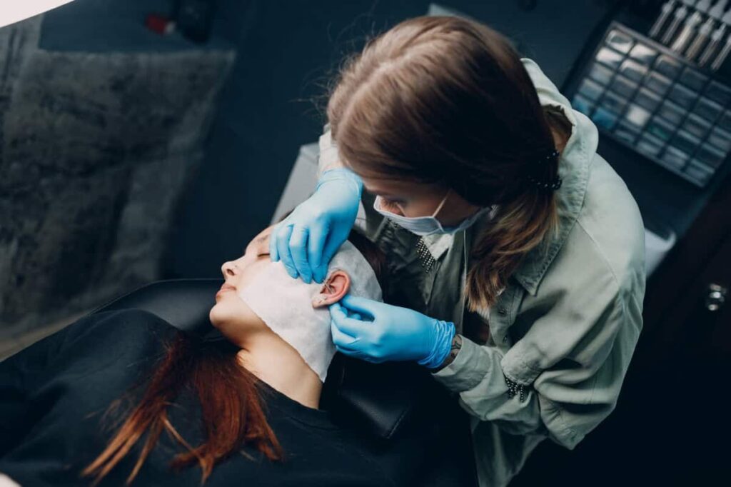 - Nacisk: Spanie na stronie z przekłuciem, noszenie zbyt ciasnych czapek, opasek czy używanie słuchawek nausznych może wywierać ciągły nacisk na przekłucie, prowadząc do podrażnień, ziarniny i migracji. Przez cały okres gojenia najlepiej spać na plecach lub na przeciwległym boku, ewentualnie używać specjalnej poduszki z dziurką.