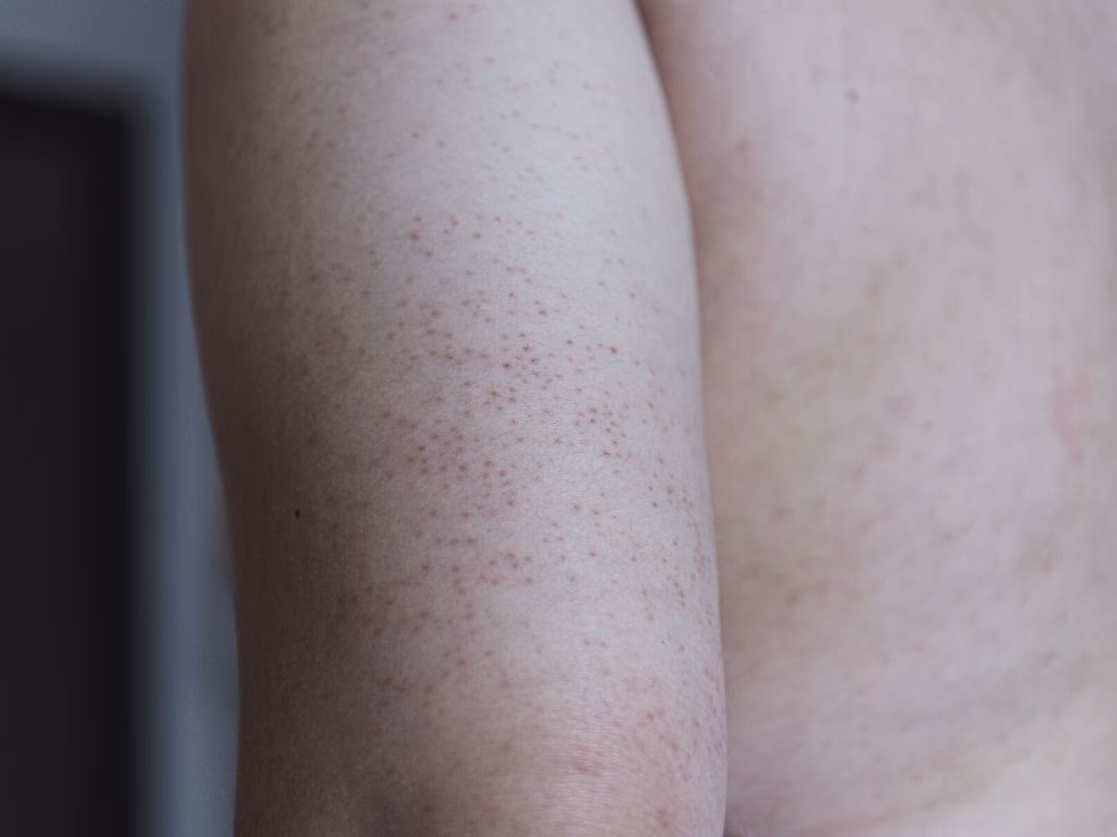 Najbardziej typowe objawy to drobne, szorstkie grudki w kolorze skóry, czerwonym lub brunatnym, zlokalizowane w okolicy mieszków włosowych, najczęściej na ramionach, udach i pośladkach. Skóra w tych miejscach jest sucha i szorstka, czasem może być zaczerwieniona i swędzieć.