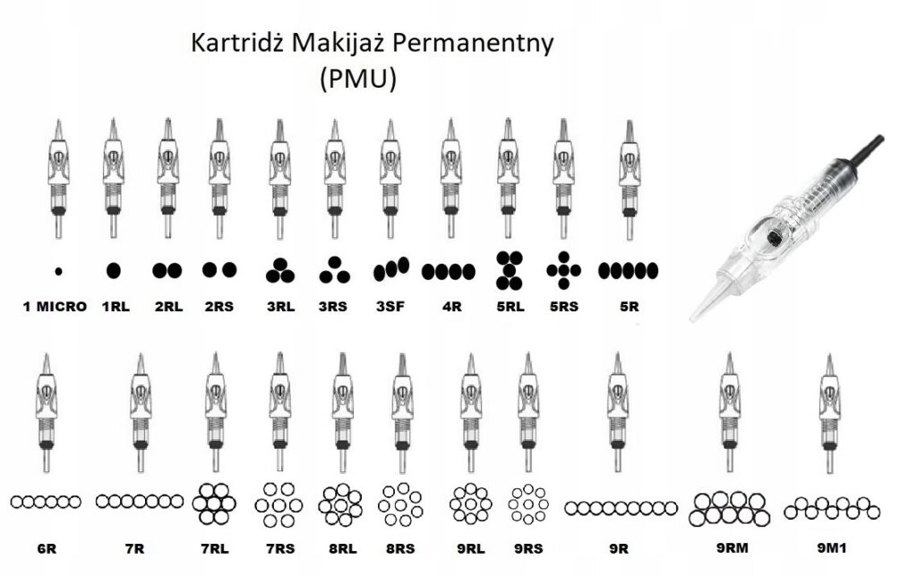 Kartridże mogą zawierać pojedynczą igłę lub wiązkę kilku zlutowanych igieł. Najpopularniejszą konfiguracją w makijażu permanentnym jest Round Liner (RL), czyli igła okrągła. Może to być pojedyncza igła (1RL) lub zlutowana wiązka igieł ułożonych w okrąg (np. 3RL, 5RL, 7RL itd.).