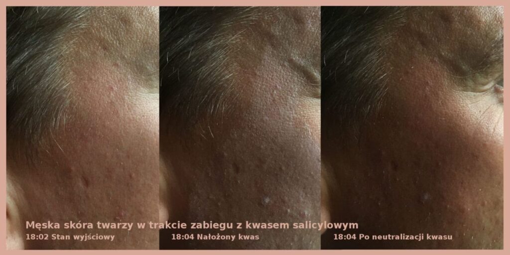 Bezpośrednio po zastosowaniu produktu z kwasem salicylowym (zwłaszcza w wyższym stężeniu lub po peelingu profesjonalnym) skóra może być lekko zaczerwieniona, napięta, a nawet odczuwalne może być delikatne mrowienie czy pieczenie. W ciągu kolejnych dni, szczególnie po zabiegu złuszczającym, może pojawić się suchość i widoczne łuszczenie naskórka. Jest to naturalny proces odnowy skóry. Regularne stosowanie produktów do użytku domowego zazwyczaj prowadzi do wygładzenia skóry, zmniejszenia widoczności porów i ogólnej poprawy jej wyglądu. Ważne jest odpowiednie nawilżanie i ochrona przed słońcem, aby zminimalizować negatywne efekty.