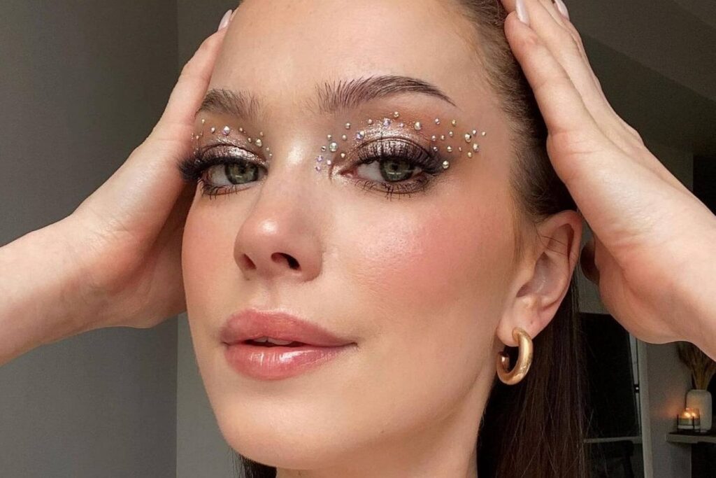 - Kryształki i Cekiny: Małe kryształki można przyklejać pojedynczo lub tworzyć z nich wzory wzdłuż linii brwi, pod okiem, na skroniach lub na kościach policzkowych. Używaj do tego kleju do rzęs – jest bezpieczny dla skóry i zapewnia dobrą trwałość.