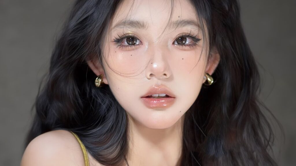 Koreański makijaż oczu skupia się na rozjaśnieniu spojrzenia i dodaniu subtelnej głębi. Zazwyczaj używa się jasnych, połyskujących cieni na całej powiece, często w odcieniach beżu, różu, brzoskwini lub jasnego brązu. Ciemniejszy odcień brązu lub szarości może być delikatnie nałożony w zewnętrznym kąciku lub wzdłuż linii rzęs, aby dodać definicji. Eyeliner typu "puppy eyes" (z opadającą kreską) jest bardzo popularny, podobnie jak delikatne podkreślenie dolnej linii rzęs jasnym cieniem lub kredką, aby otworzyć oko. Kluczem jest blendowanie i tworzenie miękkich przejść między kolorami. Rzęsy są podkręcone i pokryte tuszem dla efektu otwartego spojrzenia.