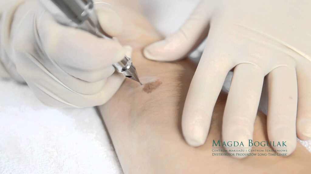 Samo wykonanie zabiegu polega na precyzyjnym wprowadzaniu dobranego wcześniej pigmentu w odbarwione miejsca za pomocą cienkiej igły lub kilku igieł, w zależności od techniki i urządzenia. Linergistka pracuje powoli i metodycznie, pokrywając całą powierzchnię plamy. Proces ten wymaga dużej wprawy, aby pigment został wprowadzony na odpowiednią głębokość i równomiernie, zapewniając naturalny wygląd.