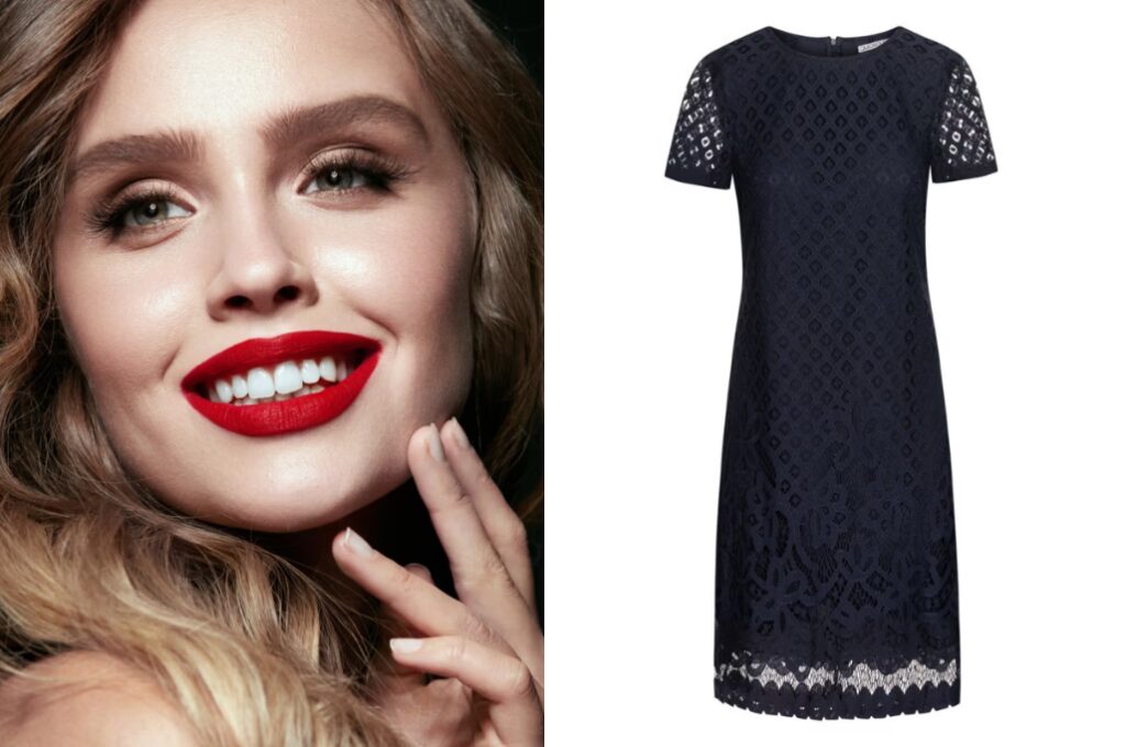 Granatowa sukienka i czerwona szminka to duet idealny na wieczorne wyjścia, randki czy uroczystości. To połączenie jest niezwykle klasyczne, eleganckie i ponadczasowe. Czerwień dodaje pewności siebie i zmysłowości. Do granatowej sukienki szczególnie pięknie pasują czerwienie z niebieskim pigmentem (tzw. chłodne czerwienie), które dodatkowo optycznie wybielają zęby. Jeśli wolisz cieplejsze odcienie czerwieni, upewnij się, że dobrze komponują się z Twoją karnacją i odcieniem sukienki. Jeśli decydujesz się na wyraziste, czerwone usta, makijaż oczu powinien być bardziej stonowany – wystarczy cienka kreska i wytuszowane rzęsy.