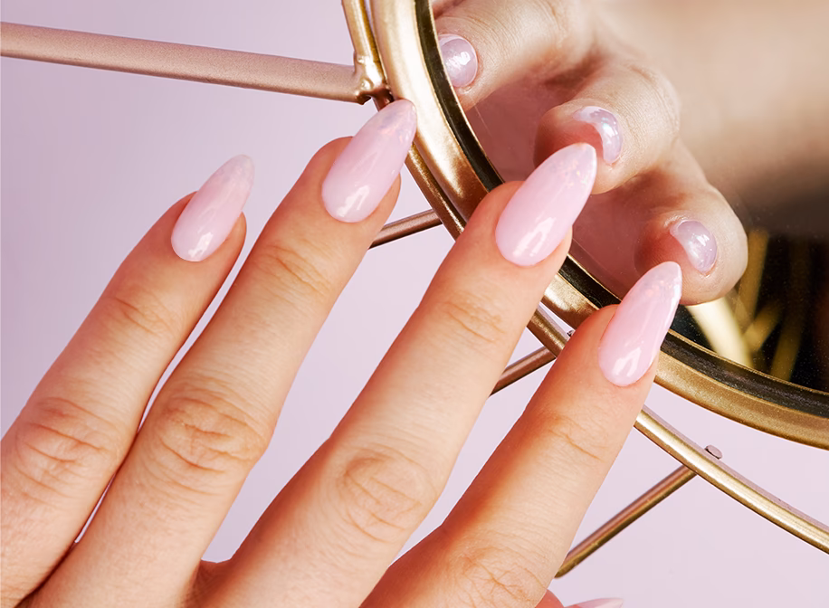 Jeśli wolisz kształt migdałka, mleczne paznokcie również będą strzałem w dziesiątkę. Na migdałkach wyglądają wręcz obłędnie, zwłaszcza w połączeniu z błyszczącymi, kontrastującymi dodatkami lub ciekawymi zdobieniami. Jednym z popularnych zdobień na migdałkach z mleczną bazą są princess nails. Aby je wykonać, zaaplikuj brokatowy lakier hybrydowy przy skórkach (lub użyj brokatowego pyłku), a następnie nadbuduj paznokieć mleczną bazą lub żelem. Przejście brokat-mleko tworzy efekt księżniczki.