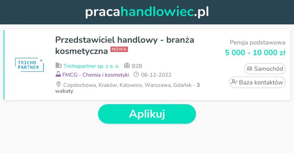 - Specjalistyczne portale pracy dla handlowców: Chociaż branża kosmetyczna nie ma dedykowanego, tak dużego portalu jak np. branża farmaceutyczna (przedstawiciele.pl), warto szukać na ogólnych portalach z możliwością filtrowania po branży lub słowach kluczowych ('kosmetyki', 'beauty', 'uroda').