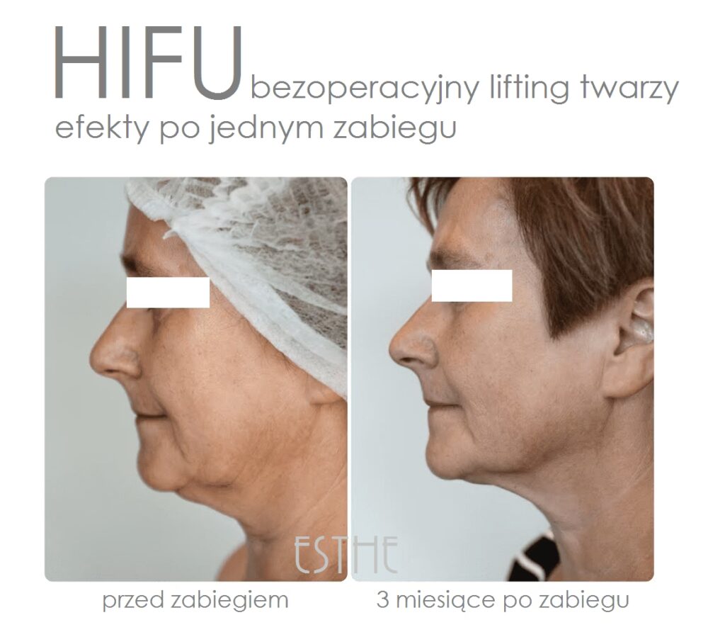 • Twarz: Oprócz redukcji zmarszczek, HIFU poprawia ogólne napięcie skóry, co przekłada się na efekt liftingu. Możliwa jest delikatna modyfikacja rysów twarzy, takich jak uwydatnienie linii żuchwy, podniesienie opadających policzków czy uniesienie brwi. Zabieg może również pomóc w wyrównaniu kolorytu skóry.