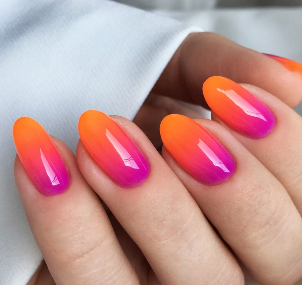 - Aplikacja gradientu (metoda pędzlem): Nałóż kolory bezpośrednio na paznokieć (np. jaśniejszy na całą płytkę, ciemniejszy na końcówkę, lub odwrotnie, zależnie od efektu ombre). Czystym, małym pędzelkiem delikatnie blenduj linię styku kolorów, wykonując ruchy rozcierające lub wklepujące w miejscu przejścia. Czyść pędzel w cleanerze/zmywaczu w miarę potrzeby. Powtarzaj, budując kolor i przejście warstwa po warstwie.